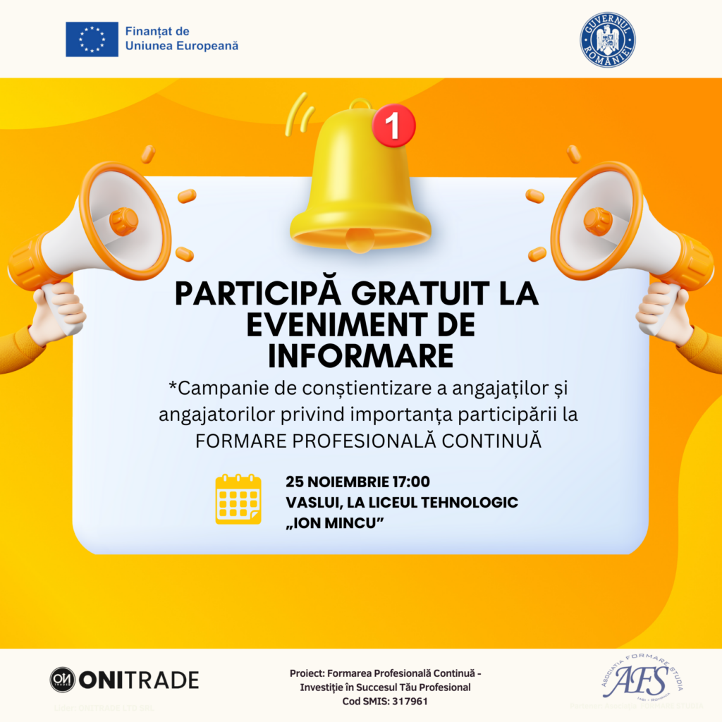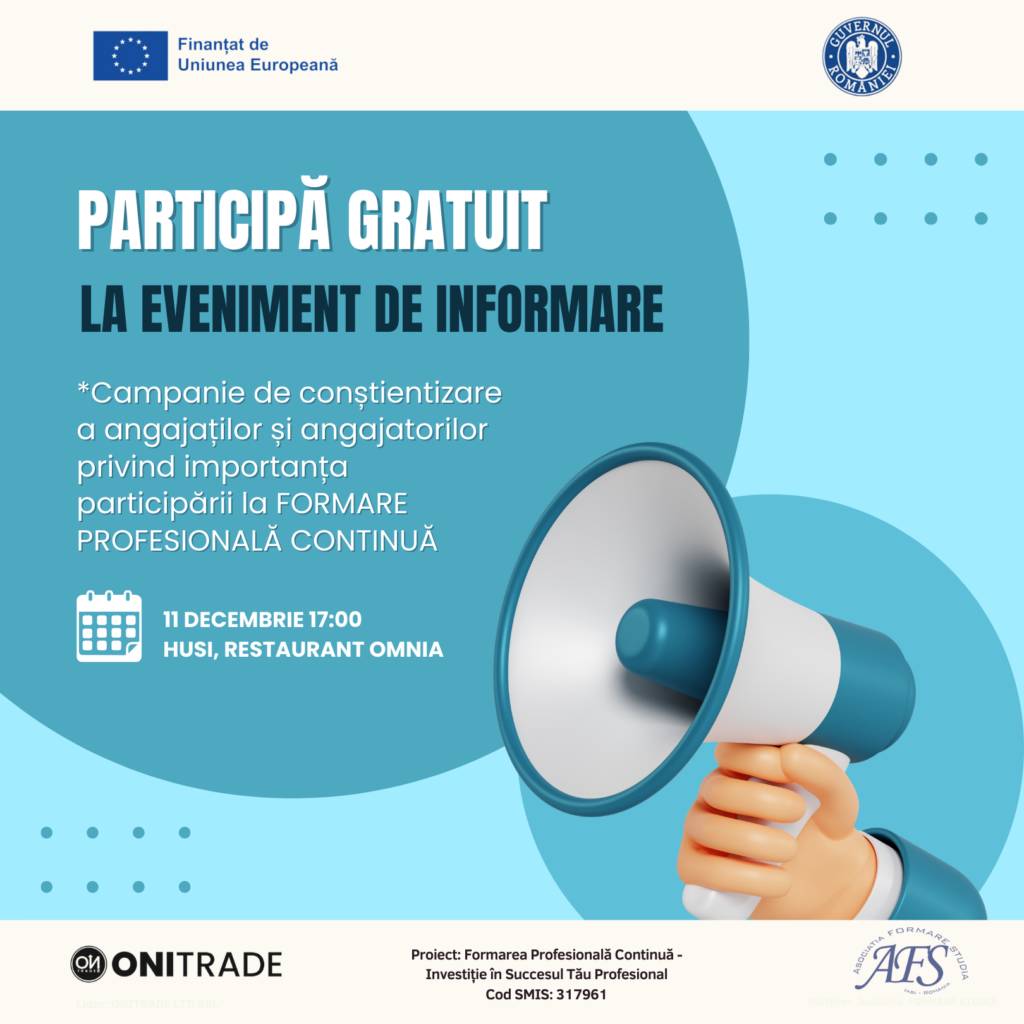 În cadrul proiectului Formarea Profesională Continuă – Investiție în Succesul Tău Profesional (Cod SMIS: 317961) se va desfășura un eveniment gratuit de informare, dedicat angajaților și angajatorilor interesați de dezvoltarea competențelor profesionale și adaptarea la cerințele actuale ale pieței muncii.