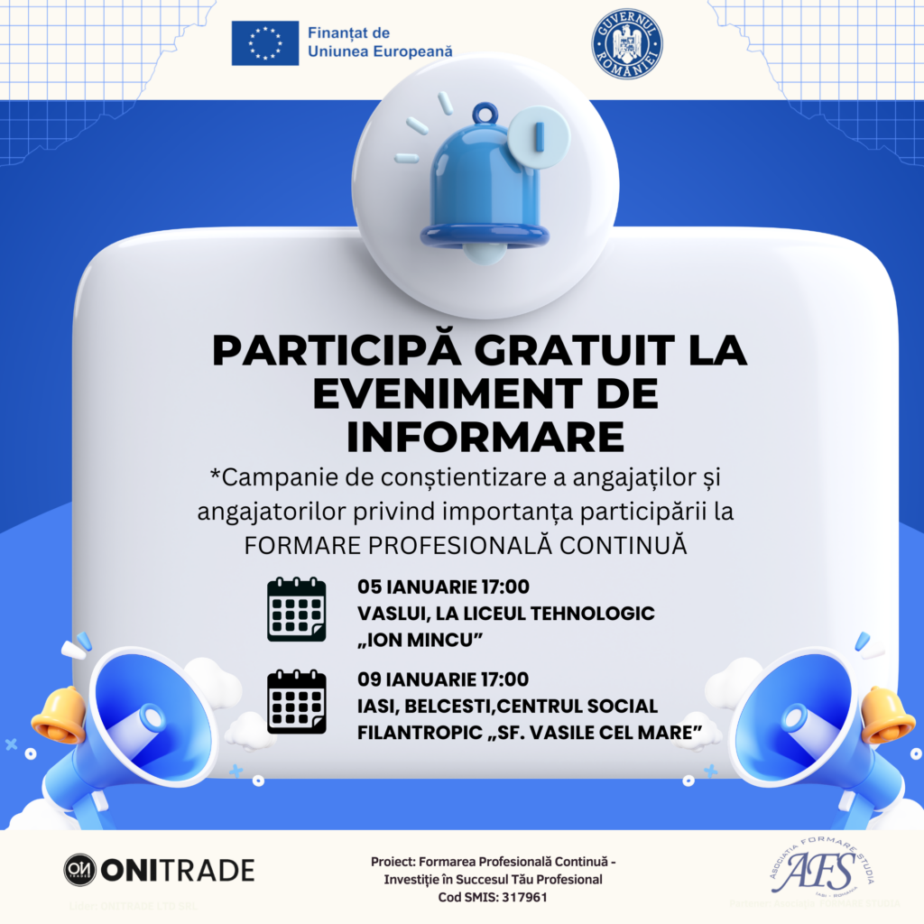 În cadrul proiectului Formarea Profesională Continuă – Investiție în Succesul Tău Profesional (Cod SMIS: 317961), va avea loc un eveniment de informare dedicat angajaților și angajatorilor interesați de dezvoltarea competențelor profesionale și adaptarea la cerințele actuale ale pieței muncii.